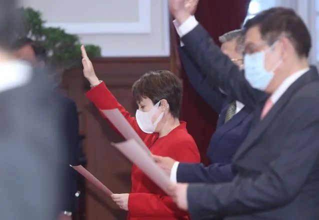 20日,臺(tái)灣新任駐美代表蕭美琴宣誓就職。穿著一身大紅外套,她顯得頗有些喜氣洋洋。